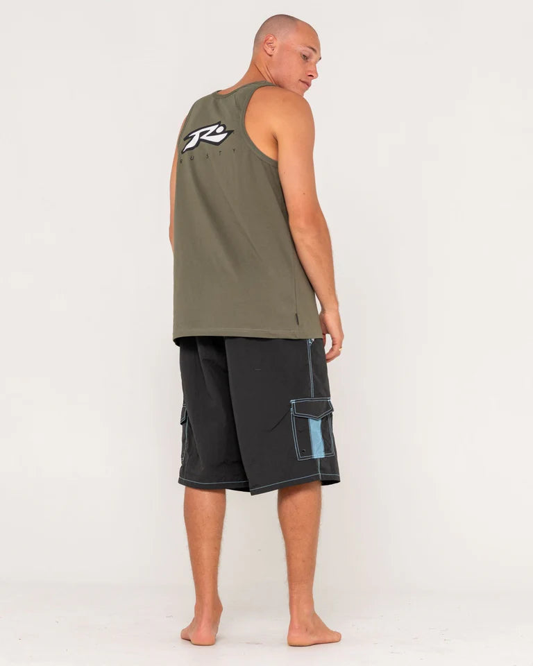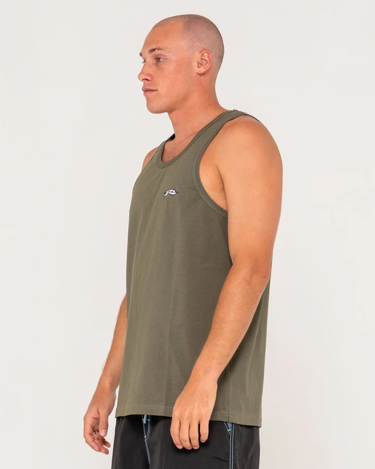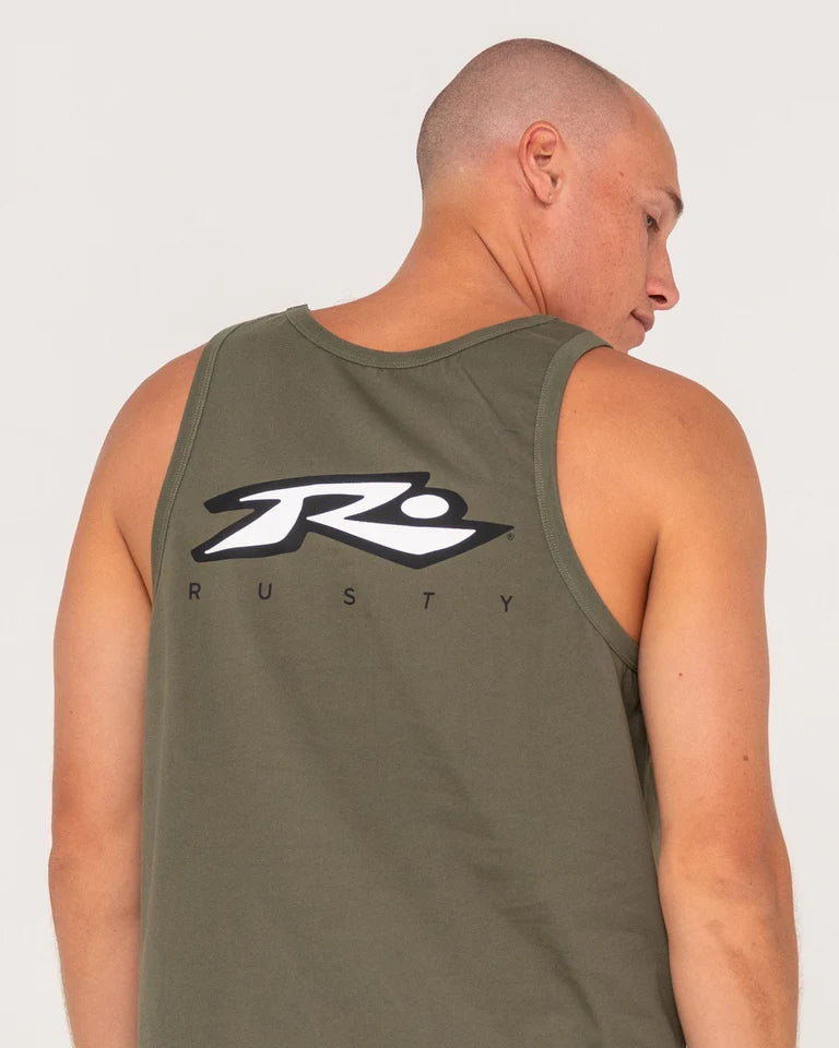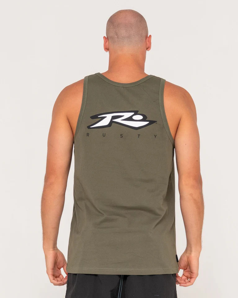 Standard Fit Tank With Rusty Chest And Back Print. 100% Cotton Midweight Jersey