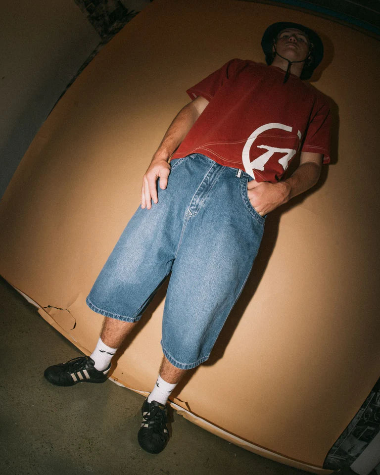 Finished in a classic Middy Blue denim wash, they’re designed to pair with cropped tees, oversized graphics or hoodies for a true streetwear look. Durable, roomy and made to stand out, these jorts are perfect for casual wear, festivals and off-duty styling.