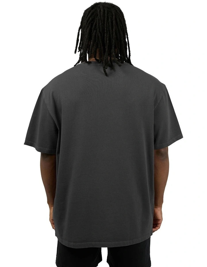The t-shirt features a pigment dye effect with a simple logo at the front