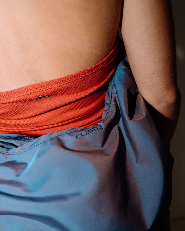 Sling Bag With Cinch Side Detail And Custom Logo Webbing. 55% Nylon / 45% Polyester