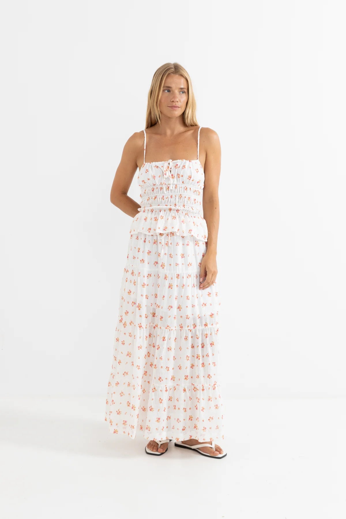 The Rosie Floral Tie Front Top by Rhythm in White blends playful charm with a flattering, slim silhouette. Designed with a gathered tie-front feature, this top delivers a feminine, eye-catching shape that pairs effortlessly with denim, skirts or matching floral pieces.
