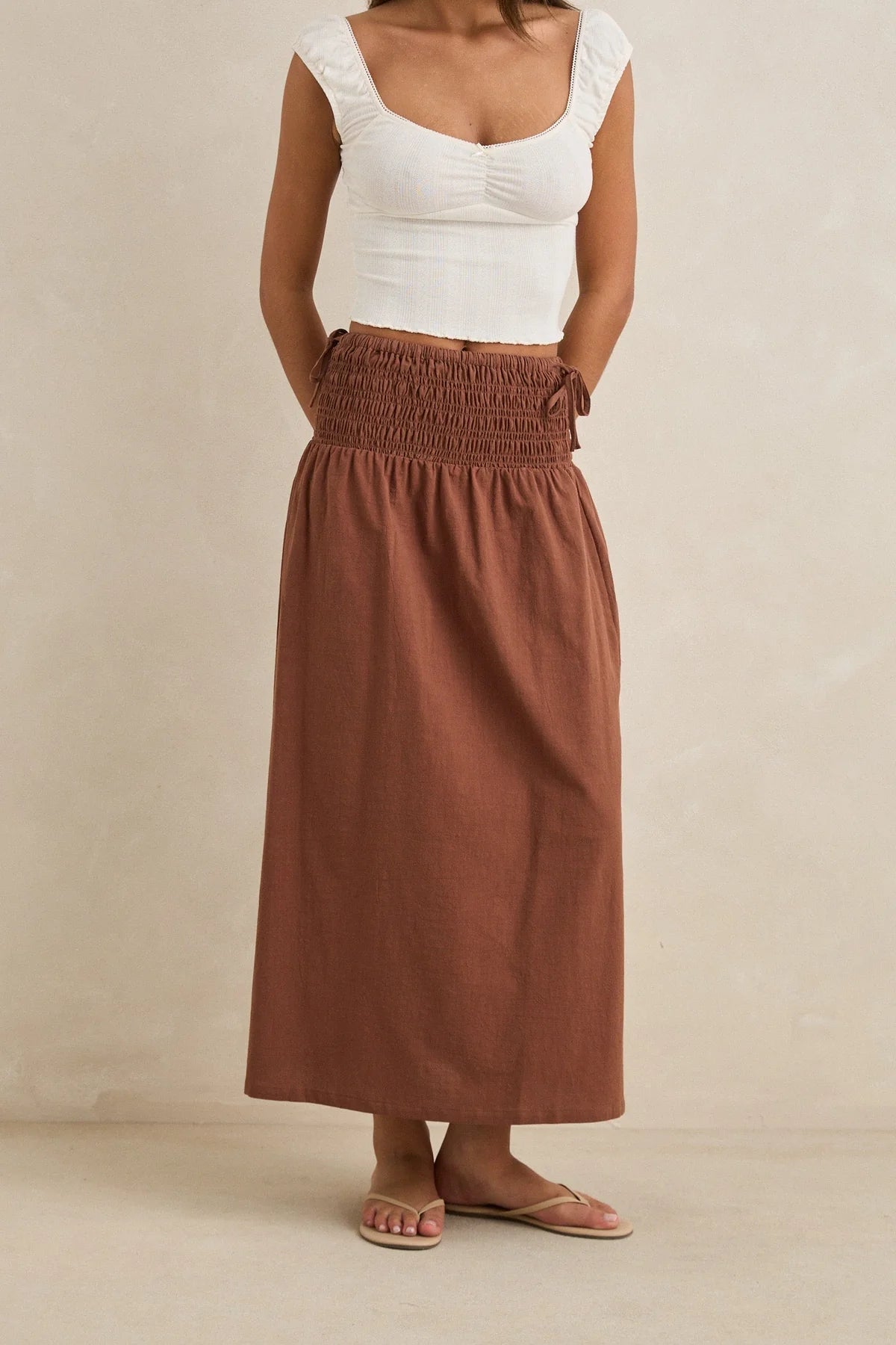 RHYTHM ALANA TIE SIDE MAXI SKIRT CHOCOLATE FLOWING COASTAL WOMENS SKIRT